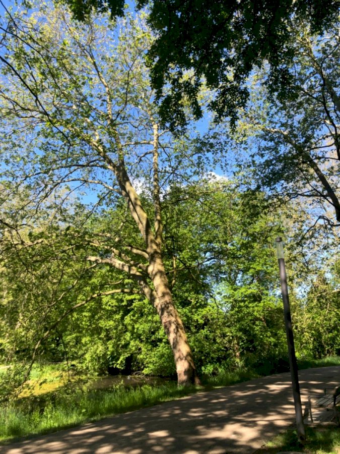 Die Ahornblättrige Platane säumt den Weg am Außenweiher und steht vis-à-vis zum Herrenhaus und zur Schlosskappelle. Sie wurde in den Nachkriegsjahren um 1950 gepflanzt.