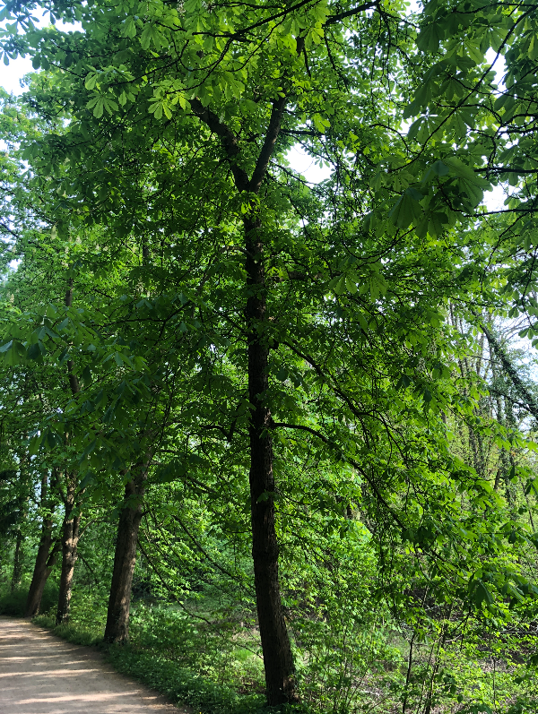 Die Rosskastanie säumt den Weg am Außenweiher zwischen Brücke und Lindenallee. Sie wurde in den Nachkriegsjahren um 1950 gepflanzt.